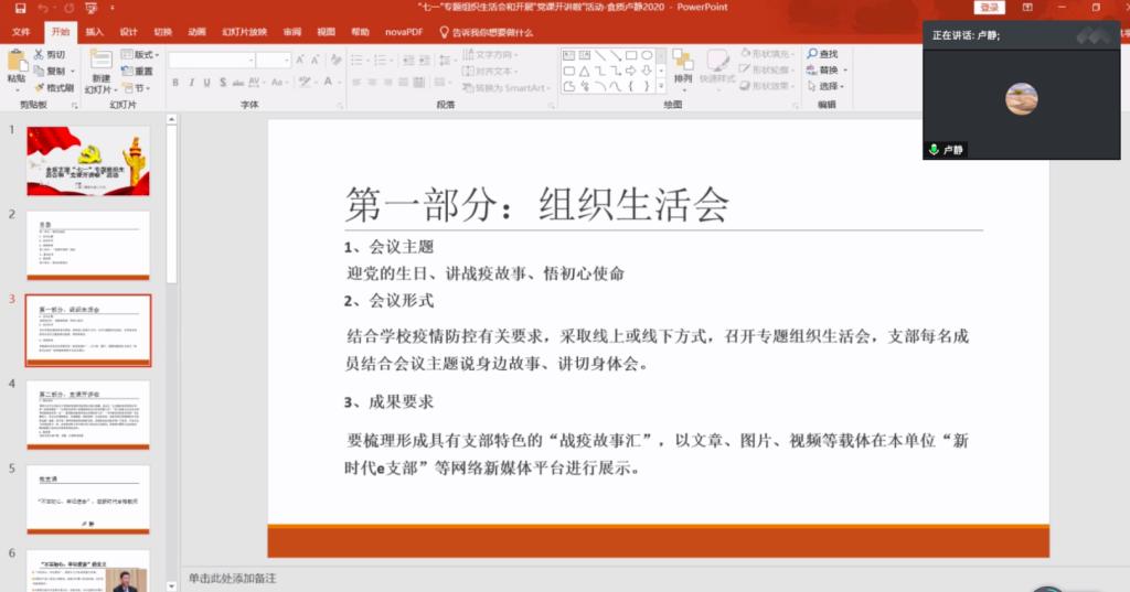 其次,支部支委委员卢静、袁媛、叶海青同志分别以“不忘初心牢记使命,做新时代合格教师“、“关于师德与学风建设的一点思考”、“沉默的英雄-记食品质量与安全系主任袁媛”为题讲授一堂专题微党课。党课受到高福和书记充分肯定,他说每个教师都蕴含无限潜能,这次会议让他深有感触,感动于每个人真实的故事和真情讲述,感动于我们优秀的党员和教师们线上教学的辛勤付出。作为党员,在纪念党99岁生日时,更应进一步牢记初心和使命,强化党性意识,在工作中进一步增强政治意识、政治纪律、政治观念,真正让党旗在我们心中和战疫一线高高飘扬、在推进学院建设中高高飘扬,让青春在在推进学院建设中绽放绚丽之花。