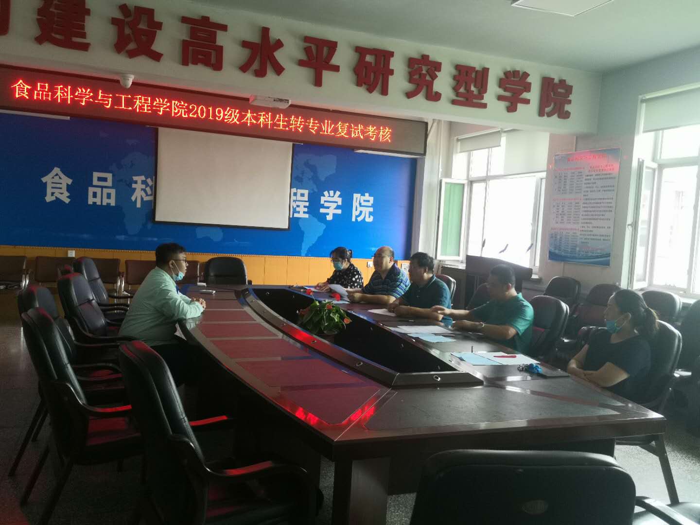 于2020年8月26日下午14:00在食品楼三楼会议室举行了2019级本科生转专业复试考核。专家组成员由党委书记高福和、教学院长周亚军、教学委员会主任潘风光、食品科学与工程系主任于亚莉、食品质量与安全系主任袁媛组成。