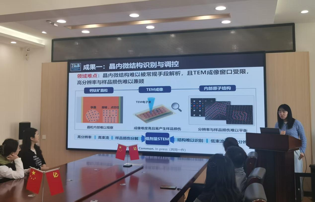 郝老师围绕钙钛矿光伏器件大面积制备兼顾“高效率”、“高稳定性”、“高能性”的难题,从“晶内微结构的识别与调控”、“晶界微结构的解析与优化”和“器件界面微结构优化”三方面开展逐级优化与调控,结合数据与实例,生动地展示了在钙钛矿光伏器件材料研究过程中的主要学习成果,并详细介绍了在跨学科研究过程中的求学心得。在交流中,郝老师与师生就跨领域学习、技术挑战、高水平论文撰写与投稿进行了深入的讨论与交流。